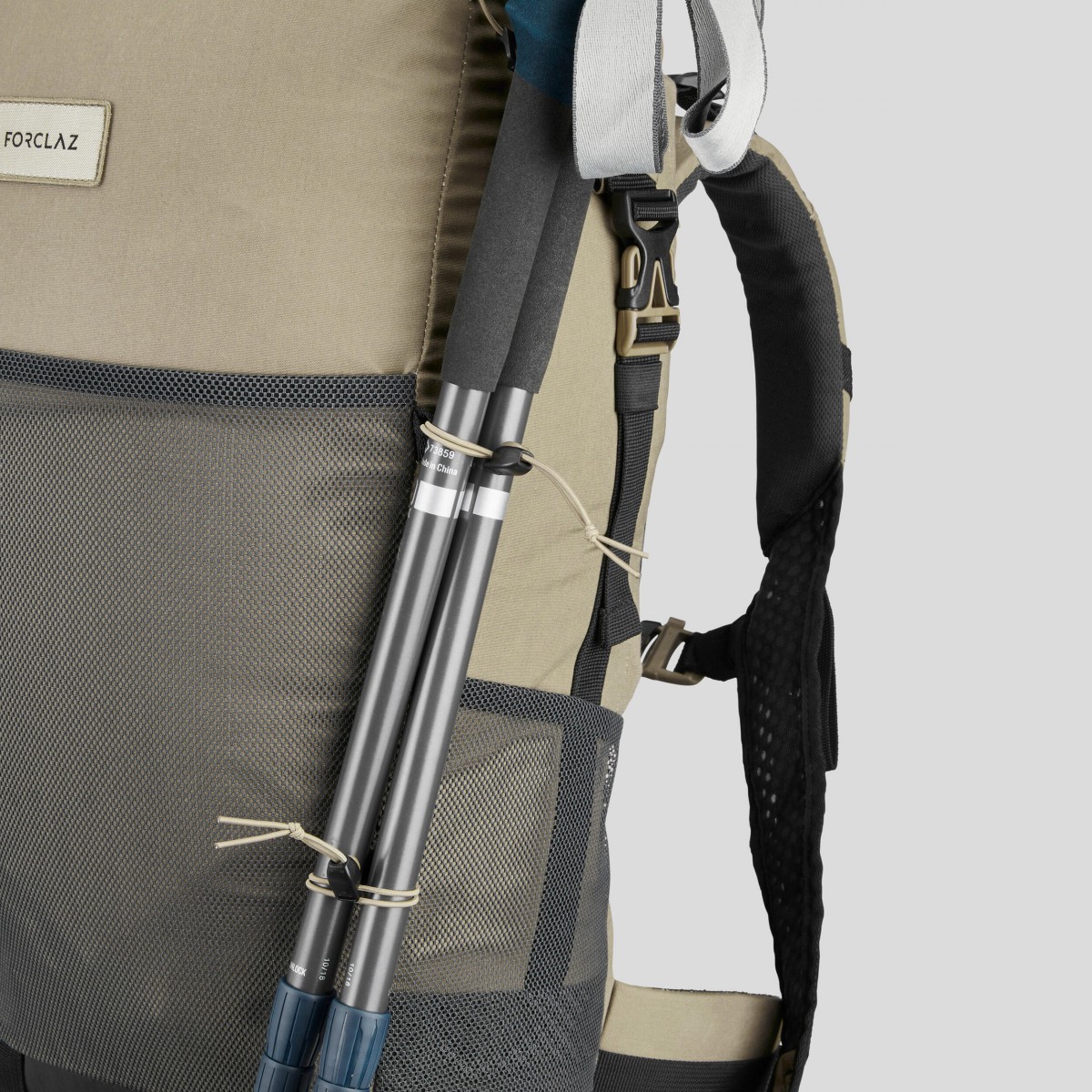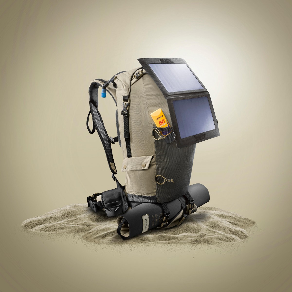 Equipada con un sistema de fijación para panel solar, bastones y una bolsa de agua, esta mochila es la compañera perfecta para todas tus necesidades en terrenos desafiantes.